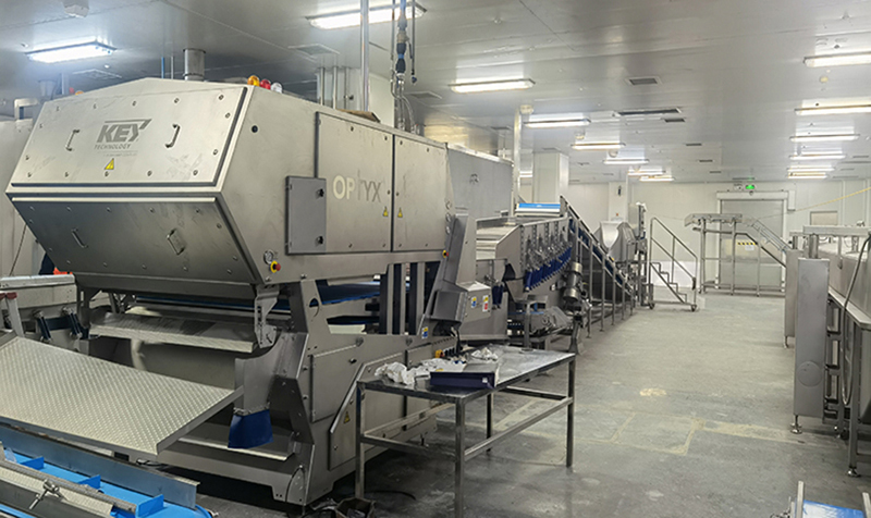 美國KEY OPTYX數字化分選機,為整條生產線的關鍵控制點。OPTYX6000型號光學分選機配有可以識別顏色、形狀、尺寸和組織結構的高分辨率相機,產品中的微小瑕疵或異物都能被準確剔除。