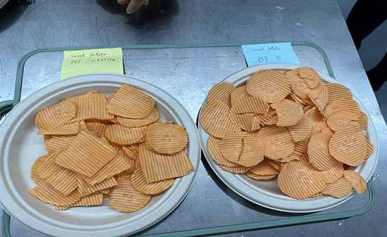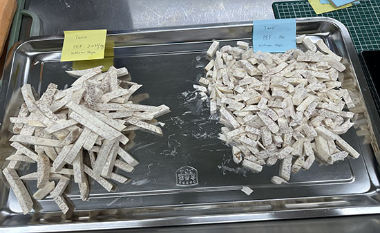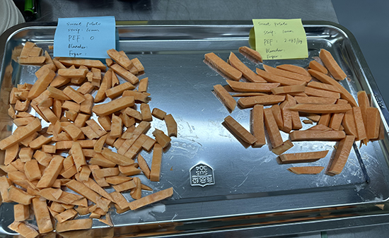 2023年8月10日,某菲律賓著名薯片生產企業一行6人來到我司北京實驗室進行相關產品的PEF(高壓脈沖電場)測試。我們對馬鈴薯、紅薯、紫薯、芋頭、蓮藕和胡蘿卜等產品進行不同比能的PEF處理,處理后進行切割及油炸相關工藝。